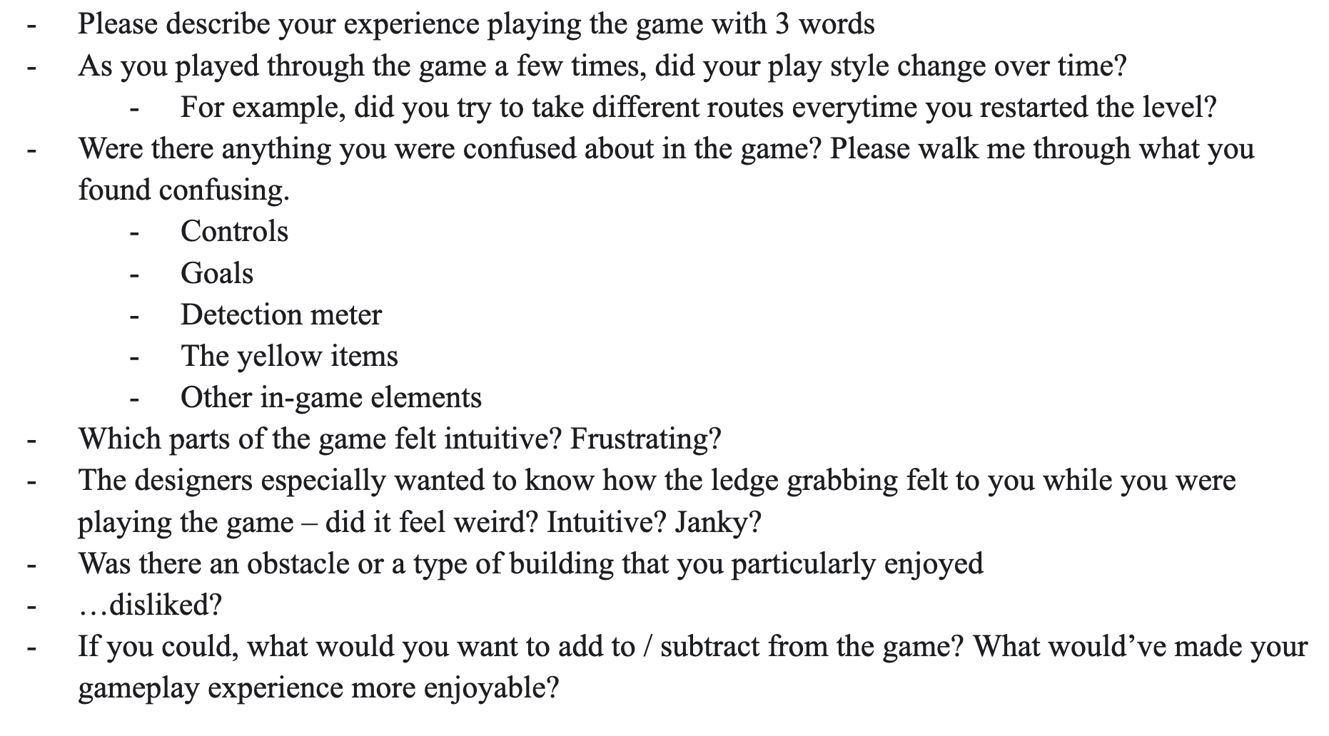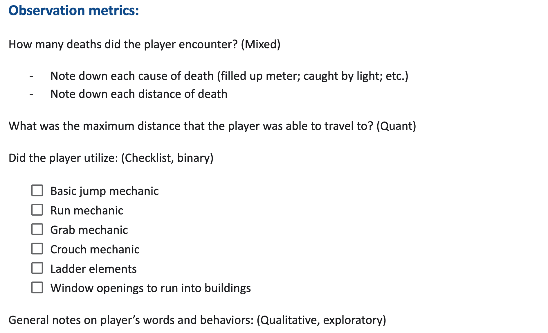 I divided the list of research questions into observation metrics (what to look out for during playtest sessions), interview questions (in-depth questions to ask players post-game), and survey questions (players’ evaluations of the game as well as additional comments).