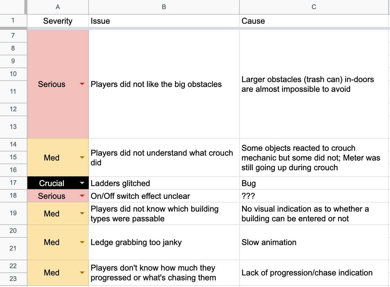 I coded and compiled a list of findings according to severity, and gave a playtest report to creative directors and interested teammates.